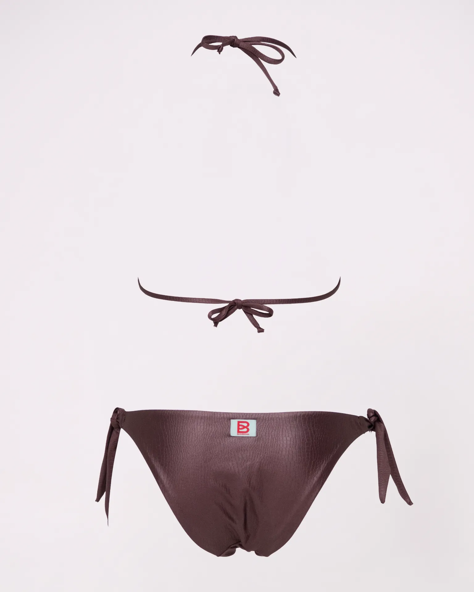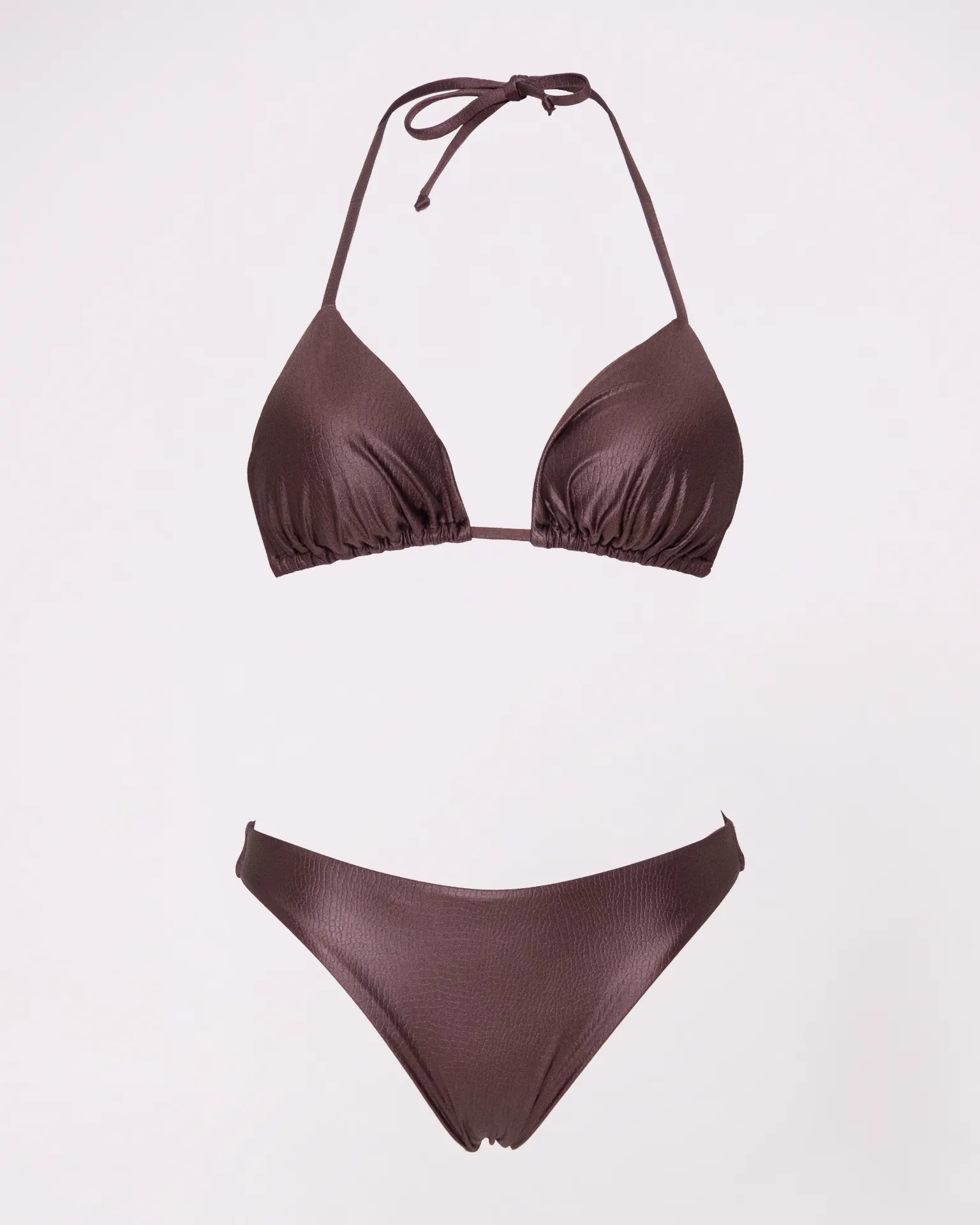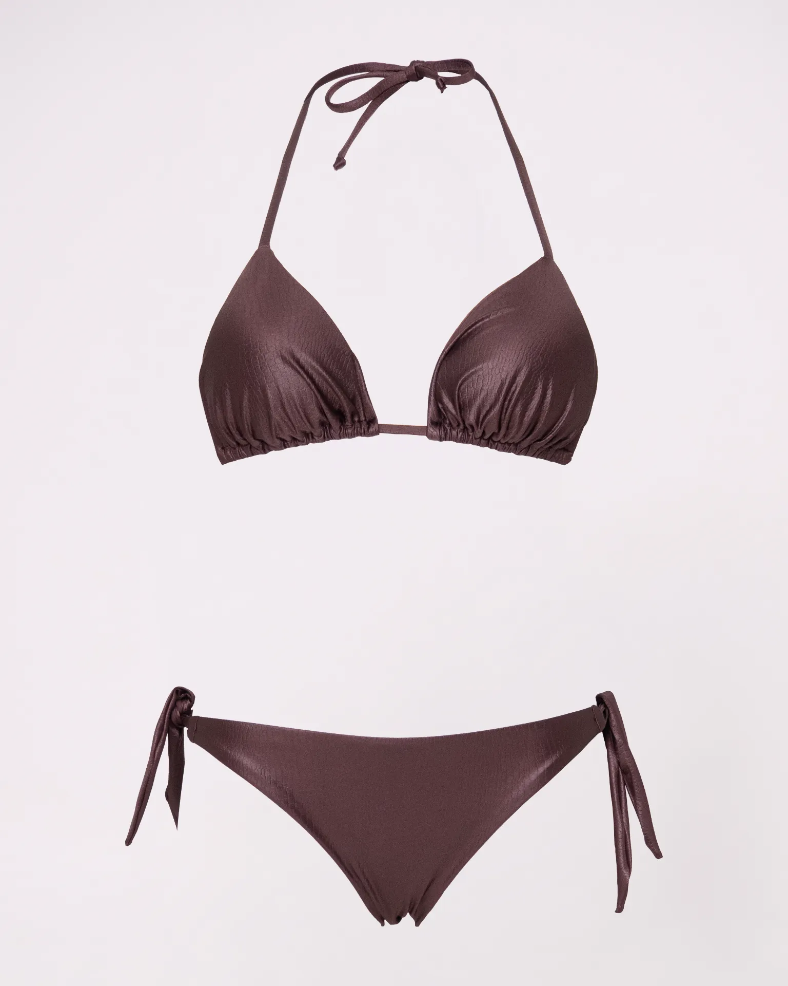Bikini triangolo con slip a fiocco regolabile sui fianchi in tessuto effetto coccodrillo, senza cuciture visibili e morbido al tatto: non stringe e garantisce comfort totale. Modello giovanile e moderno che esalta la figura in modo naturale, perfetto per spiaggia, piscina o vacanze estive. Design elegante e versatile, unisce stile originale e praticità per un look mare sempre alla moda e fresco. Ideale per chi cerca un bikini trendy e confortevole.. Consigli top: vestibilità regolare scegliere la propria taglia consiglio per bottom: vestibilità regolare scegliere la propria taglia