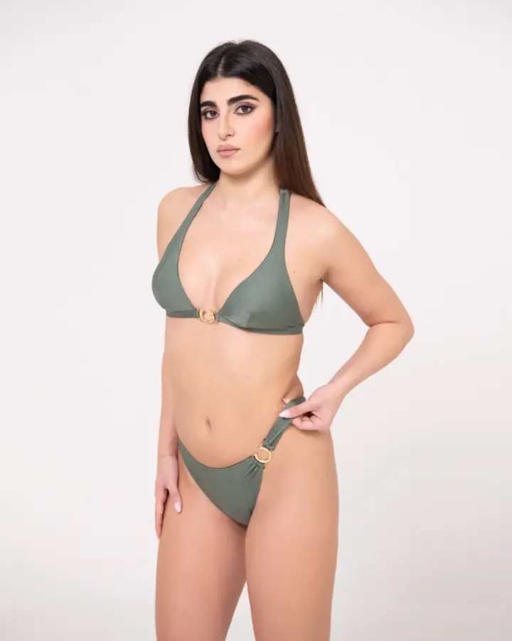 Bikini triangolo vela donna dal design slim minimal luxury, ideale per valorizzare la silhouette. Il top bikini con scollatura impreziosita da accessorio oro dona luce al décolleté ed è dotato di coppette estraibili e chiusura retro con gancio per una vestibilità confortevole e sicura. Slip perizoma regolabile senza cuciture visibili, vestibilità slim regolare. Dettagli raffinati con accessori oro su top e slip. Ideale come costume da bagno minimal chic,