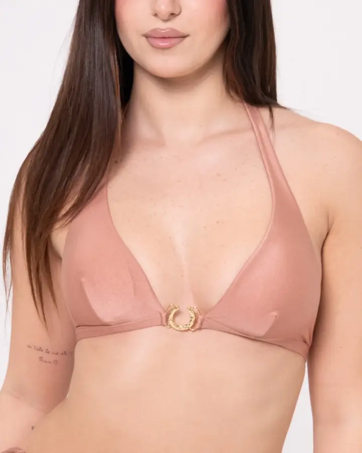 Bikini triangolo vela donna dal design slim minimal luxury, ideale per valorizzare la silhouette. Il top bikini con scollatura impreziosita da accessorio oro dona luce al décolleté ed è dotato di coppette estraibili e chiusura retro con gancio per una vestibilità confortevole e sicura. Slip perizoma regolabile senza cuciture visibili, vestibilità slim regolare. Dettagli raffinati con accessori oro su top e slip. Ideale come costume da bagno minimal chic,